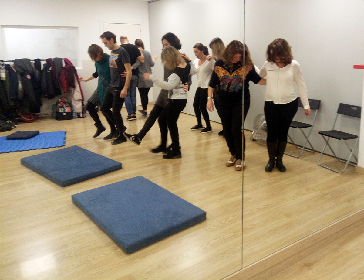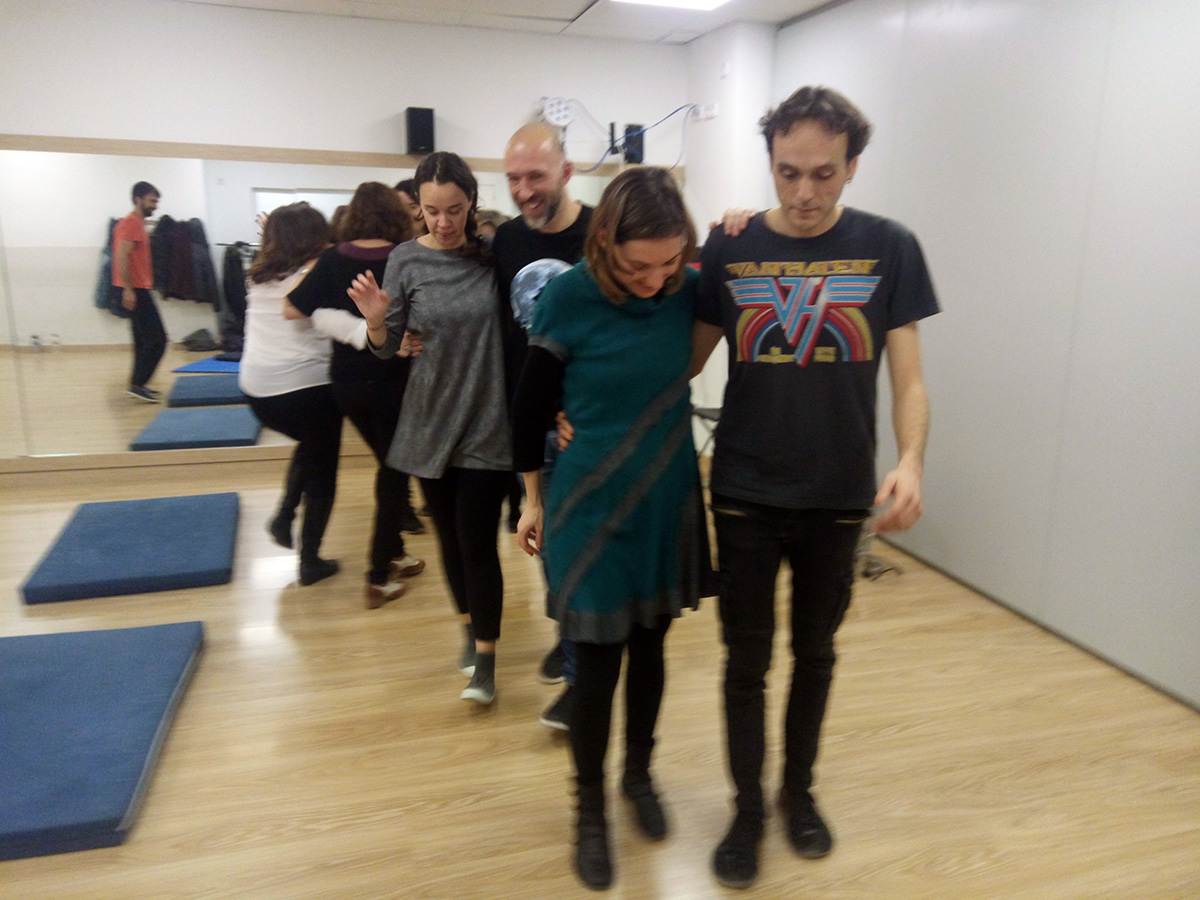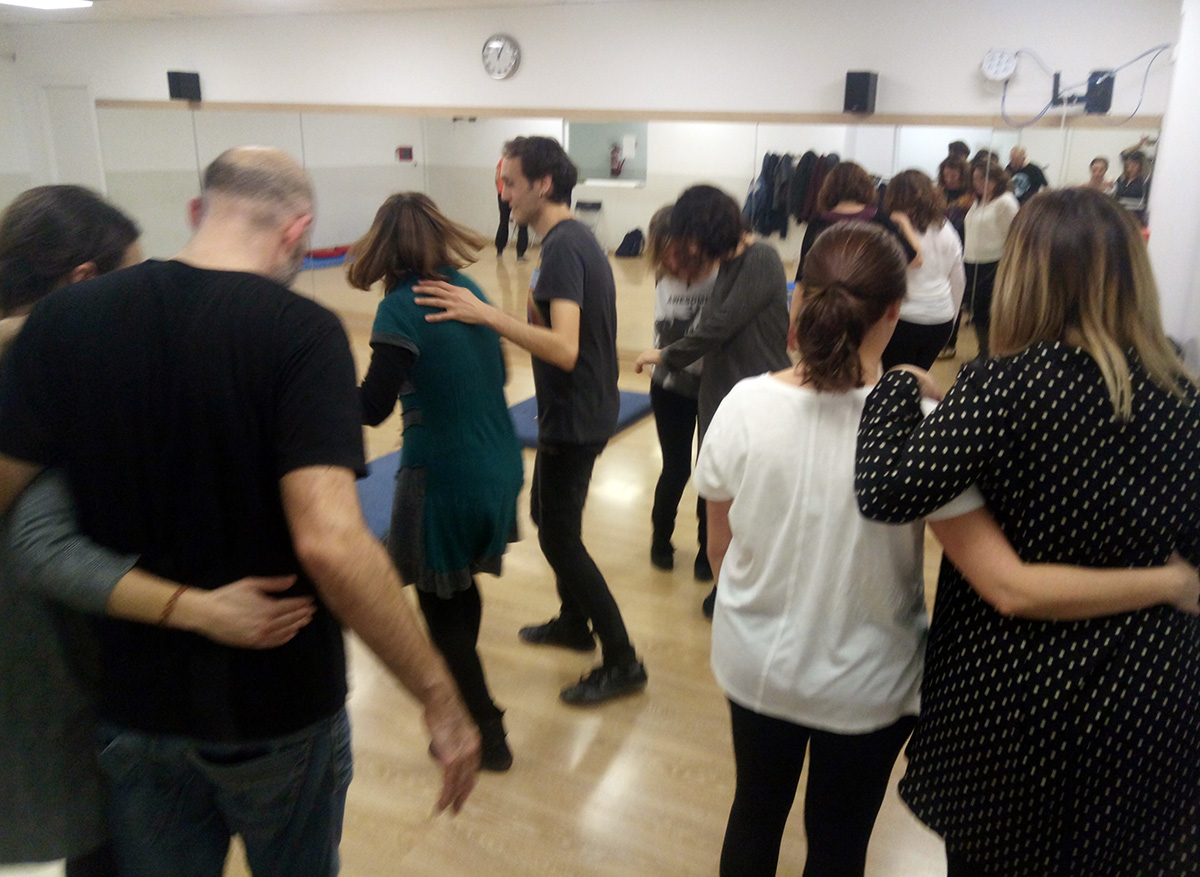 Diferenciarmos el taller en dos partes: “fluyendo conmigo” y “fluyendo con el otro”. En la primera parte, la danza era con uno mismo, permitiéndonos contactar con el propio movimiento, con la música de las diferentes emociones y pensamientos sin juzgarnos, acogiendo lo que emergiera de nosotros y permitiendo, a nuestro ritmo, ir incorporando lo que nos hiciera falta para estar más a gusto. A través de diferentes dinámicas fuimos “metiéndonos” el swing en el cuerpo y el movimiento se fue aligerando y volviendo espontáneo y sincero.